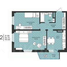 Квартира расположена на 2 этаже 11-этажного дома первого корпуса ЖК "RIVER PARK-2". Общая площадь — 64,25м², жилая площадь — 30,39м² (две комнаты площадью 16,03м² и 14,36м²), площадь кухни-гостиной — 17,64м². Высота потолков — 2,7 метра. Окна выходят на улицу. Имеется просторный балкон с панорамным остеклением. Санузел раздельный. В квартире выполнен ремонт white box, что позволяет воплотить любые дизайнерские идеи. Также чистовую отделку можно заказать прямо у застройщика.