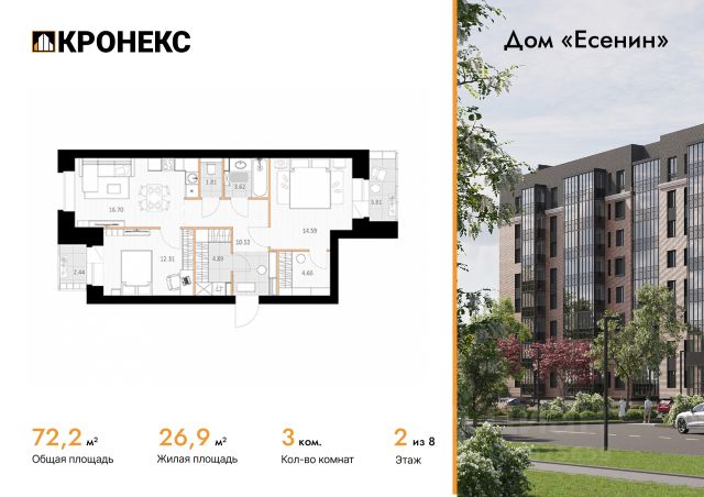 Продается 3-комн. кв-ра площадью 72.23 кв.м на 2 этаже 8 этажного кирпичного дома в Дом "Есенин" ГК Кронекс. Добро пожаловать в авторский дом "Есенин" новое слово в городском комфорте. Обширная закрытая территория проекта граничит с сектором низкой застройки, что обеспечивает свободный обзор пространства даже из окон нижних этажей. Район отличается разнообразной сервисной инфраструктурой в 5-10 минутах ходьбы от дома. При этом оживлённость улицы не доставит беспокойства будущим жильцам, благодаря максимальной звукоизоляции окон. Особенной гордостью создателей проекта является авторская ландшафтная архитектура, включающая множество зон для отдыха детей и взрослых, собственный парк и поле для командных спортивных игр. Авторский дом "Есенин" сочетает масштаб и технологичность с тёплой эстетикой и уютной обособленностью, что придётся по душе ценителям камерной атмосферы старого города. Архитектура Фасад дома выполнен в сдержанной цветовой гамме, где кирпичная кладка приятного оттенка гармонично сочетается с темными элементами отделки. Это придает зданию элегантность. Большие окна, обеспечивают отличное естественное освещение в квартирах. Остекленные балконы добавляют современности и функциональности, предоставляя дополнительное пространство для отдыха и наслаждения видами.