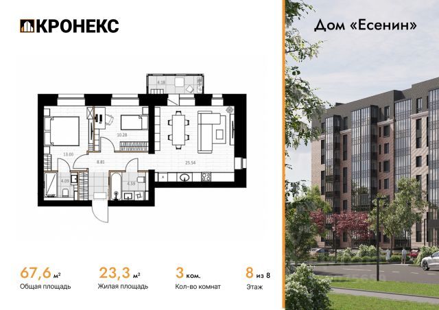 Продается 3-комн. кв-ра площадью 67.56 кв.м на 8 этаже 8 этажного кирпичного дома в Дом "Есенин" ГК Кронекс. Добро пожаловать в авторский дом "Есенин" новое слово в городском комфорте. Обширная закрытая территория проекта граничит с сектором низкой застройки, что обеспечивает свободный обзор пространства даже из окон нижних этажей. Район отличается разнообразной сервисной инфраструктурой в 5-10 минутах ходьбы от дома. При этом оживлённость улицы не доставит беспокойства будущим жильцам, благодаря максимальной звукоизоляции окон. Особенной гордостью создателей проекта является авторская ландшафтная архитектура, включающая множество зон для отдыха детей и взрослых, собственный парк и поле для командных спортивных игр. Авторский дом "Есенин" сочетает масштаб и технологичность с тёплой эстетикой и уютной обособленностью, что придётся по душе ценителям камерной атмосферы старого города. Архитектура Фасад дома выполнен в сдержанной цветовой гамме, где кирпичная кладка приятного оттенка гармонично сочетается с темными элементами отделки. Это придает зданию элегантность. Большие окна, обеспечивают отличное естественное освещение в квартирах. Остекленные балконы добавляют современности и функциональности, предоставляя дополнительное пространство для отдыха и наслаждения видами.