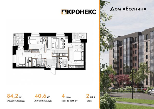 Продается 4-комн. кв-ра площадью 84.24 кв.м на 2 этаже 8 этажного кирпичного дома в Дом "Есенин" от ГК Кронекс. Добро пожаловать в авторский дом "Есенин" новое слово в городском комфорте. Обширная закрытая территория проекта граничит с сектором низкой застройки, что обеспечивает свободный обзор пространства даже из окон нижних этажей. Район отличается разнообразной сервисной инфраструктурой в 5-10 минутах ходьбы от дома. При этом оживлённость улицы не доставит беспокойства будущим жильцам, благодаря максимальной звукоизоляции окон. Особенной гордостью создателей проекта является авторская ландшафтная архитектура, включающая множество зон для отдыха детей и взрослых, собственный парк и поле для командных спортивных игр. Авторский дом "Есенин" сочетает масштаб и технологичность с тёплой эстетикой и уютной обособленностью, что придётся по душе ценителям камерной атмосферы старого города. Архитектура Фасад дома выполнен в сдержанной цветовой гамме, где кирпичная кладка приятного оттенка гармонично сочетается с темными элементами отделки. Это придает зданию элегантность. Большие окна, обеспечивают отличное естественное освещение в квартирах. Остекленные балконы добавляют современности и функциональности, предоставляя дополнительное пространство для отдыха и наслаждения видами.