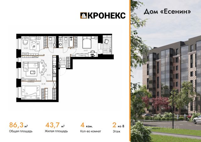 Продается 4-комн. кв-ра площадью 86.26 кв.м на 2 этаже 8 этажного кирпичного дома в Дом "Есенин" от ГК Кронекс. Добро пожаловать в авторский дом "Есенин" новое слово в городском комфорте. Обширная закрытая территория проекта граничит с сектором низкой застройки, что обеспечивает свободный обзор пространства даже из окон нижних этажей. Район отличается разнообразной сервисной инфраструктурой в 5-10 минутах ходьбы от дома. При этом оживлённость улицы не доставит беспокойства будущим жильцам, благодаря максимальной звукоизоляции окон. Особенной гордостью создателей проекта является авторская ландшафтная архитектура, включающая множество зон для отдыха детей и взрослых, собственный парк и поле для командных спортивных игр. Авторский дом "Есенин" сочетает масштаб и технологичность с тёплой эстетикой и уютной обособленностью, что придётся по душе ценителям камерной атмосферы старого города. Архитектура Фасад дома выполнен в сдержанной цветовой гамме, где кирпичная кладка приятного оттенка гармонично сочетается с темными элементами отделки. Это придает зданию элегантность. Большие окна, обеспечивают отличное естественное освещение в квартирах. Остекленные балконы добавляют современности и функциональности, предоставляя дополнительное пространство для отдыха и наслаждения видами.