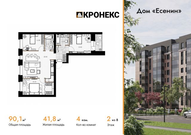 Продается 4-комн. кв-ра площадью 86.26 кв.м на 2 этаже 8 этажного кирпичного дома в Дом "Есенин" от ГК Кронекс. Добро пожаловать в авторский дом "Есенин" новое слово в городском комфорте. Обширная закрытая территория проекта граничит с сектором низкой застройки, что обеспечивает свободный обзор пространства даже из окон нижних этажей. Район отличается разнообразной сервисной инфраструктурой в 5-10 минутах ходьбы от дома. При этом оживлённость улицы не доставит беспокойства будущим жильцам, благодаря максимальной звукоизоляции окон. Особенной гордостью создателей проекта является авторская ландшафтная архитектура, включающая множество зон для отдыха детей и взрослых, собственный парк и поле для командных спортивных игр. Авторский дом "Есенин" сочетает масштаб и технологичность с тёплой эстетикой и уютной обособленностью, что придётся по душе ценителям камерной атмосферы старого города. Архитектура Фасад дома выполнен в сдержанной цветовой гамме, где кирпичная кладка приятного оттенка гармонично сочетается с темными элементами отделки. Это придает зданию элегантность. Большие окна, обеспечивают отличное естественное освещение в квартирах. Остекленные балконы добавляют современности и функциональности, предоставляя дополнительное пространство для отдыха и наслаждения видами.