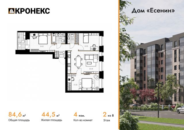 Продается 4-комн. кв-ра площадью 85.61 кв.м на 2 этаже 8 этажного кирпичного дома в Дом "Есенин" ГК Кронекс. Добро пожаловать в авторский дом "Есенин" новое слово в городском комфорте. Обширная закрытая территория проекта граничит с сектором низкой застройки, что обеспечивает свободный обзор пространства даже из окон нижних этажей. Район отличается разнообразной сервисной инфраструктурой в 5-10 минутах ходьбы от дома. При этом оживлённость улицы не доставит беспокойства будущим жильцам, благодаря максимальной звукоизоляции окон. Особенной гордостью создателей проекта является авторская ландшафтная архитектура, включающая множество зон для отдыха детей и взрослых, собственный парк и поле для командных спортивных игр. Авторский дом "Есенин" сочетает масштаб и технологичность с тёплой эстетикой и уютной обособленностью, что придётся по душе ценителям камерной атмосферы старого города. Архитектура Фасад дома выполнен в сдержанной цветовой гамме, где кирпичная кладка приятного оттенка гармонично сочетается с темными элементами отделки. Это придает зданию элегантность. Большие окна, обеспечивают отличное естественное освещение в квартирах. Остекленные балконы добавляют современности и функциональности, предоставляя дополнительное пространство для отдыха и наслаждения видами.