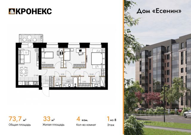 Продается 4-комн. кв-ра площадью 90.73 кв.м на 4 этаже 8 этажного кирпичного дома в Дом "Есенин" ГК Кронекс. Добро пожаловать в авторский дом "Есенин" новое слово в городском комфорте. Обширная закрытая территория проекта граничит с сектором низкой застройки, что обеспечивает свободный обзор пространства даже из окон нижних этажей. Район отличается разнообразной сервисной инфраструктурой в 5-10 минутах ходьбы от дома. При этом оживлённость улицы не доставит беспокойства будущим жильцам, благодаря максимальной звукоизоляции окон. Особенной гордостью создателей проекта является авторская ландшафтная архитектура, включающая множество зон для отдыха детей и взрослых, собственный парк и поле для командных спортивных игр. Авторский дом "Есенин" сочетает масштаб и технологичность с тёплой эстетикой и уютной обособленностью, что придётся по душе ценителям камерной атмосферы старого города. Архитектура Фасад дома выполнен в сдержанной цветовой гамме, где кирпичная кладка приятного оттенка гармонично сочетается с темными элементами отделки. Это придает зданию элегантность. Большие окна, обеспечивают отличное естественное освещение в квартирах. Остекленные балконы добавляют современности и функциональности, предоставляя дополнительное пространство для отдыха и наслаждения видами.