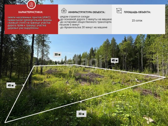 Продам земельный участок 10 соток Ижс Преимущества участка: — 10 соток — ровный, сухой, высокая точка. — — Подведена линия электропередач. — Круглогодичный подъезд — асфальт до деревни. — Назначение — Ижс (возможность прописки). Инфраструктура рядом: — Магазин, аптека, школа, детский сад — пешком 10 минут. — Остановка общественного транспорта — 5 минут пешком. — Песчаный пляж — 5 минут на велосипеде. — Сосновый лес и чистый воздух. Удобная локация: — 30 минут на машине до Архангельска. — Быстрый доступ к трассе и городским маршрутам. Почему это отличный вариант: — Идеально для семей с детьми и тех, кто хочет тишину + удобства. — Подготовлен под стройку — можно начинать прямо в этом сезоне! — Хорошее место для дома с видом и террасой. — Ограниченное Количество Участков. — Ответим на все интересующие Вас вопросы. Земельные Участки. Продажа участка строго для дачи.