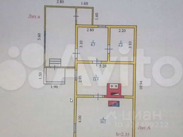 Общая площадь 100 м2. Гостиная-кухня 16 м2, три комнаты 11; 19,4 и 13,2 м2. Прихожая 23 м2, обшита вагонкой. Пристроено крыльцо с окнами около 20 м2. Печное отопление, печь из кирпича, стоит на своем фундаменте. Рядом с участком находится колонка, есть возможность завести центральное водоснабжение в дом.