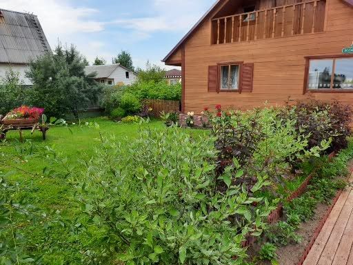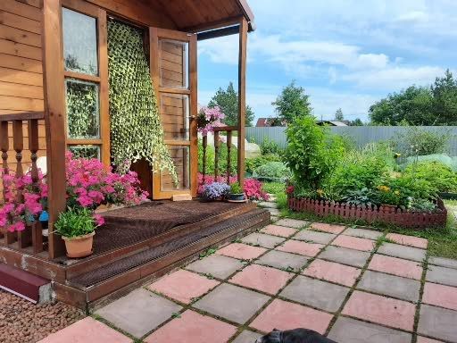 Участок ровный и сухой, грядки, газон, различные декоративные кустарники и растения, многолетние цветы. На участке также имеется хозяйственная постройка, дровяник, садовые качели, по периметру участка установлен основательный забор из профлиста на бетонных столбах, сделаны ворота, есть заезд на участок, для парковки двух авто.