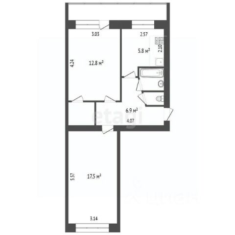 Площадь квартиры - 46.4 кв.м, две раздельные комнаты 17.1 и 15,4 кв.м, а кухня - 5 4 кв.м. Высота потолков - 2,52. Окна выходят на разные стороны дома. На все установлены счетчики.