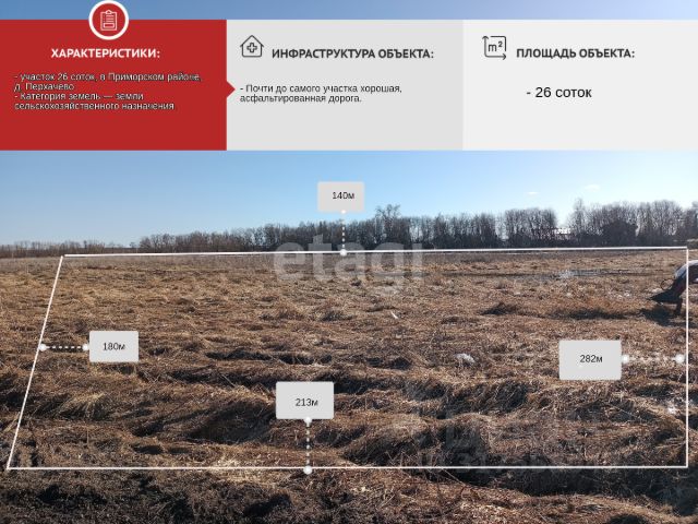 Продаётся земельный участок 529 сотки, в Приморском районе (Заостровье), д. Перхачево. На против находится КантриКлаб. Участок ровный, сухой, прямоугольной формы. Виды разрешенного использования — для сельскохозяйственного производства. Категория земель — земли сельскохозяйственного назначения. Почти до самого участка хорошая, асфальтированная дорога. Звоните или пишите, с удовольствием покажем вам участок! Код пользователя: 140714 Номер в базе: 7765186