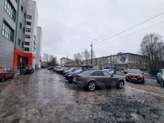 Рядом у здания расположена автомобильная парковка, проходит плотный пешеходный трафик. На 1 этаже находятся кафе, пункт выдачи и магазины.