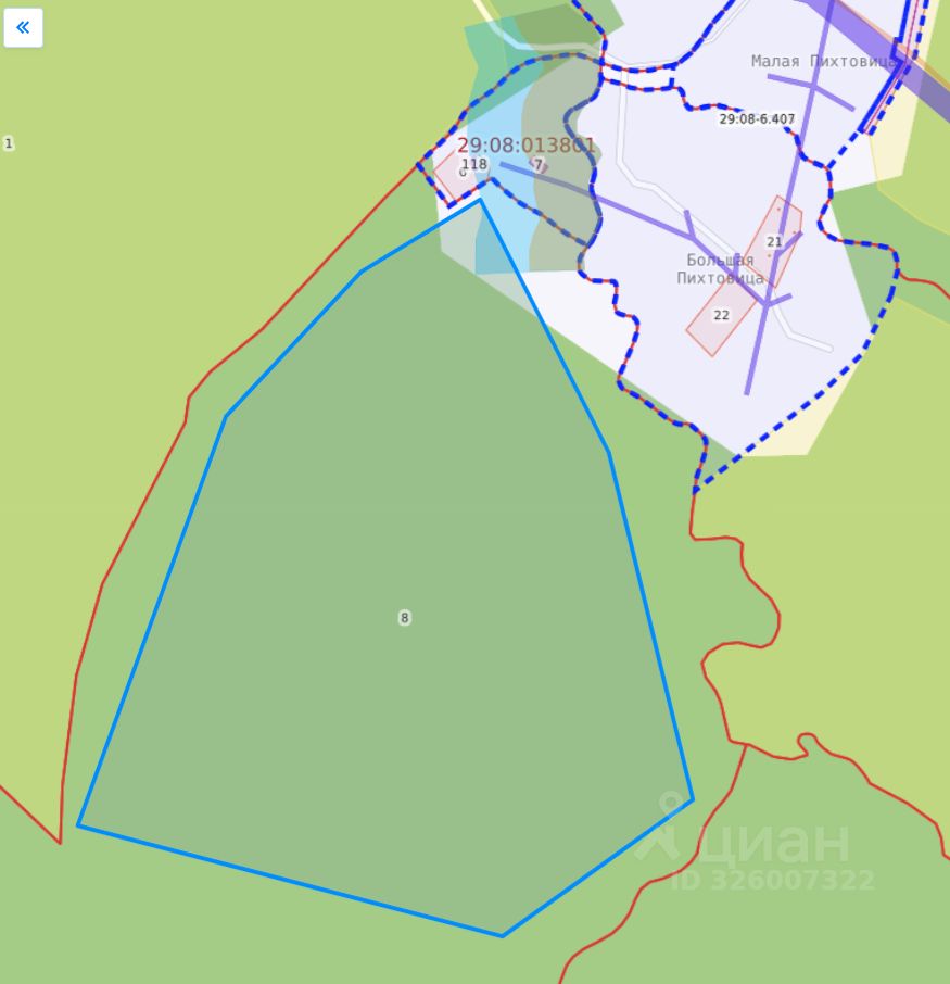 Земельный участок с кадастровым номером 29:08:015606:8 площадь 234000 по адресу обл. Архангельская, р-н Красноборский, с/с Алексеевский, д. Большая Пихтовица. Разрешенное использование земельного участка: для целей сортоиспытания и сельскохозяйственного производства.