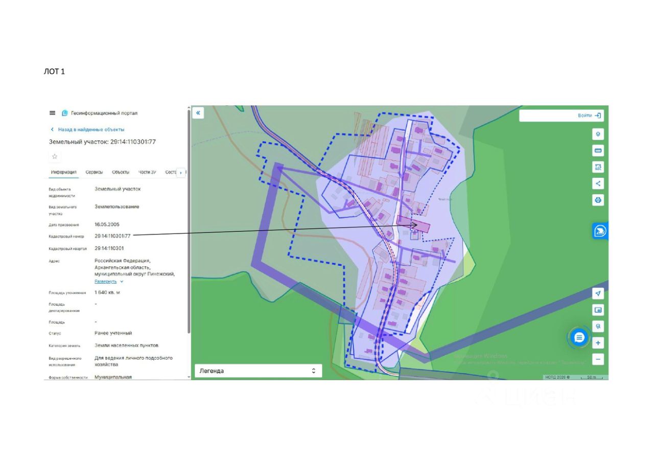 земельный участок, находящийся в муниципальной собственности Пинежского муниципального округа с кадастровым номером 29:14:110301:77, площадью 1640 кв.м., разрешенное использование для ведения личного подсобного хозяйства, категория земель земли населенных пунктов, местоположение: Российская Федерация, Архангельская область, муниципальный округ Пинежский, деревня Чешегора, улица Озерная, земельный участок 4