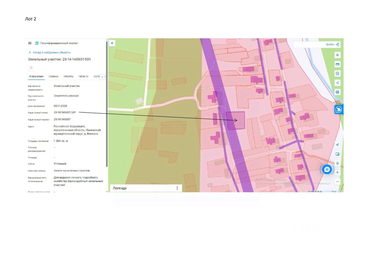 земельный участок, находящийся в государственной собственности, до разграничения с кадастровым номером 29:14: 140601:591, площадью 1384 кв.м., разрешенное использование для ведения личного подсобного хозяйства (приусадебный земельный участок), категория земель земли населенных пунктов, местоположение: Российская Федерация, Архангельская область, Пинежский муниципальный округ, д. Воепала.