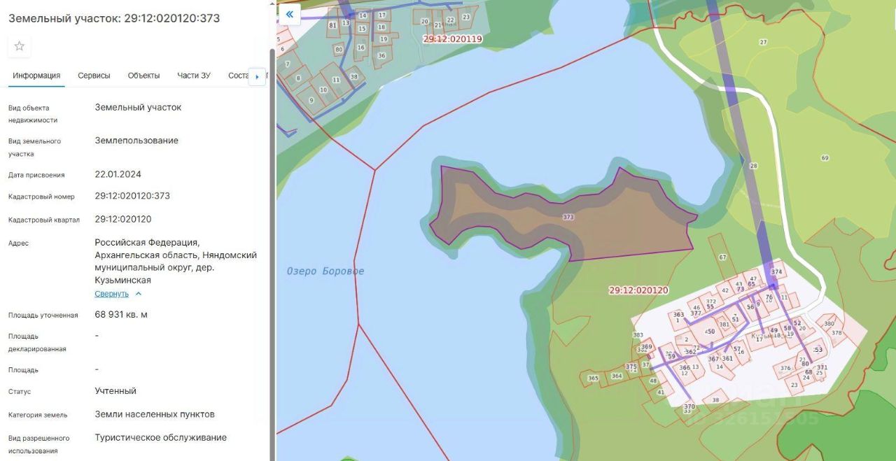 Земельный участок из земель населенных пунктов, с кадастровым номером 29:12:020120:373, расположенный: Российская Федерация, Архангельская область, Няндомский муниципальный округ, дер. Кузьминская, площадью 68931 кв. м., с видом разрешенного использования: туристическое обслуживание
