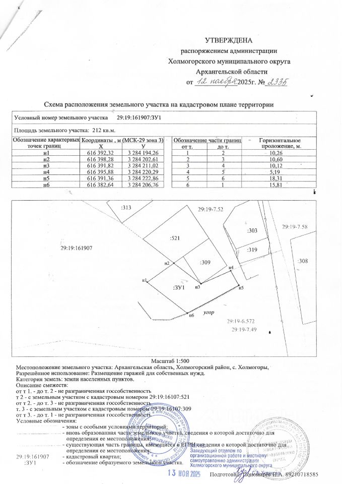 Земельный участок с кадастровым номером 29:19:161907:547, площадь 212 кв.м, категория земель земли населенных пунктов, разрешенное использование размещение гаражей для собственных нужд, местоположение: Российская Федерация, Архангельская область, Холмогорский муниципальный округ, село Холмогоры. Доступ к земельному участку осуществляется с северо-восточной стороны земельного участка от земель общего пользования. Срок аренды - 30 месяцев.