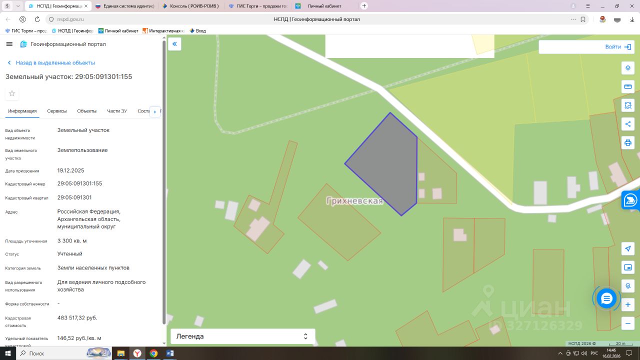 Земельный участок с кадастровым номером 29:05:091301:155 площадь 3300 по адресу Российская Федерация, Архангельская область, муниципальный округ Каргопольский, деревня Грихневская