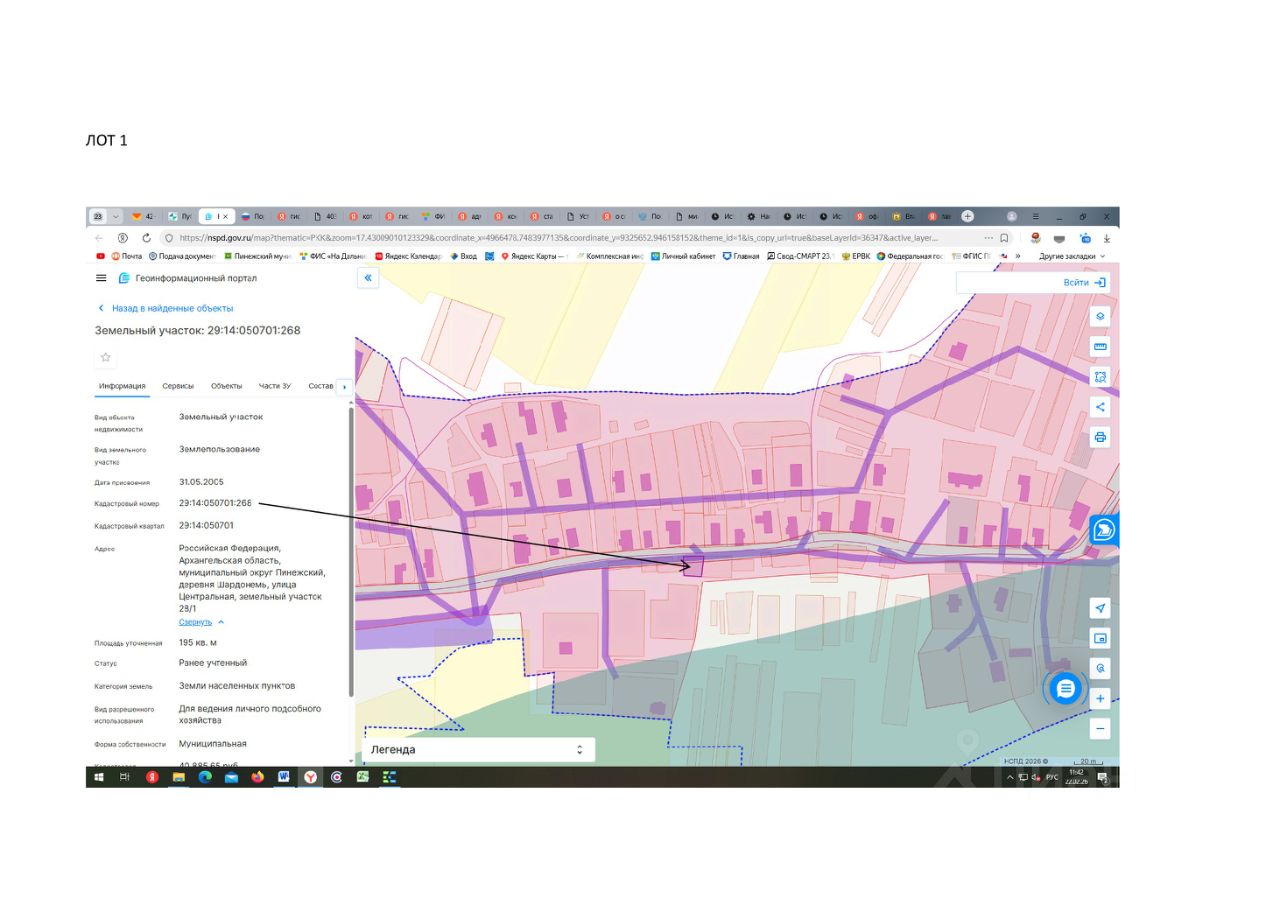 земельный участок, находящийся в муниципальной собственности Пинежского муниципального округа с кадастровым номером 29:14:050701:268, площадью 195 кв.м., разрешенное использование для ведения личного подсобного хозяйства, категория земель земли населенных пунктов, местоположение: Российская Федерация, Архангельская область, муниципальный округ Пинежский, деревня Шардонемь, улица Центральная, земельный участок 28/1.