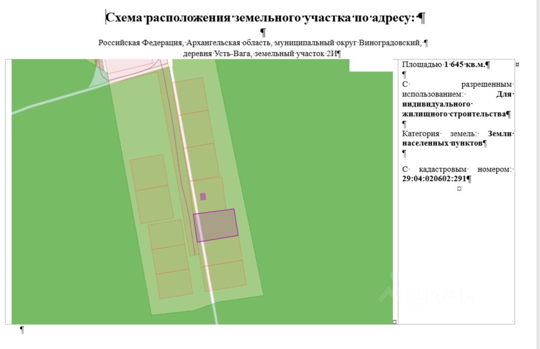Земельный участок с кадастровым номером 29:04:020602:291, расположенный по адресу: Российская Федерация, Архангельская область, муниципальный округ Виноградовский, деревня Усть-Вага, земельный участок 2И, разрешенное использование - для индивидуального жилищного строительства, категория земель - земли населенных пунктов