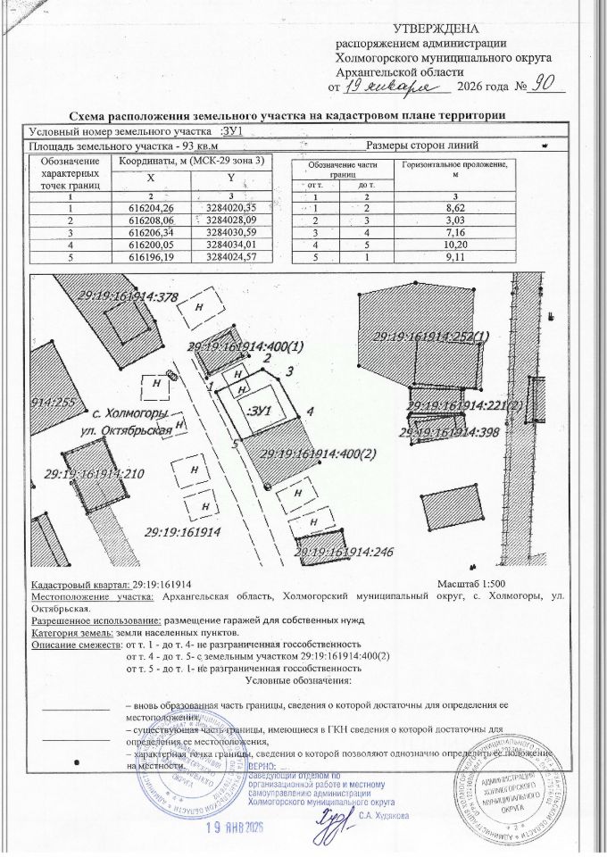 Земельный участок с кадастровым номером 29:19:161914:436, площадь 93 кв.м, категория земель земли населенных пунктов, разрешенное использование размещение гаражей для собственных нужд, местоположение: Российская Федерация, Архангельская область, Холмогорский муниципальный округ, с. Холмогоры, ул. Октябрьская. Доступ к образуемому земельному участку осуществляется с юго-западной стороны земельного участка от земель общего пользования.