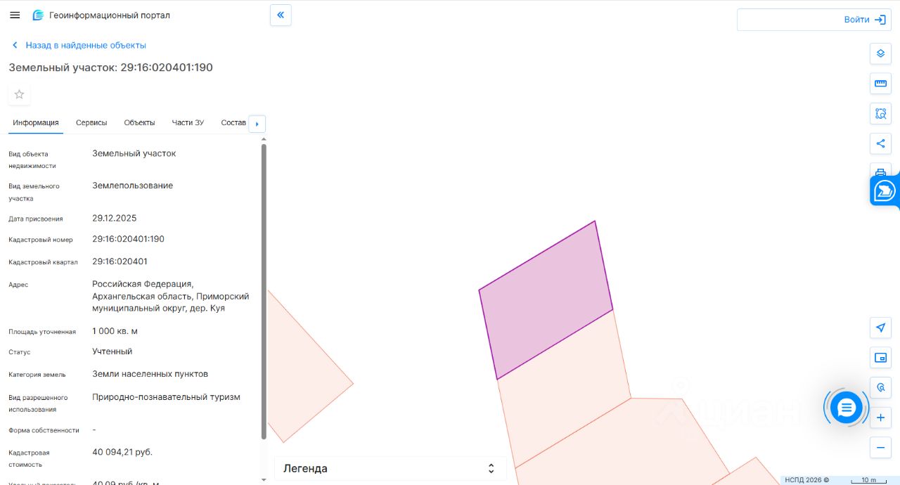 Предмет аукциона: Право на заключение договора аренды земельного участка. Срок аренды земельного участка: 3 года Местоположение земельного участка: Архангельская область, Приморский муниципальный округ, дер. Куя Категория земель: земли населенных пунктов Площадь земельного участка: 1 000 кв.м. Кадастровый номер: 29:16:020401:190 Форма собственности: земельный участок, государственная собственность на который не разграничена. Территориальная зона: зона озелененных территорий общего пользования (Р-6). Разрешенное использование земельного участка: природно-познавательный туризм. Обременение: земельный участок ограничен в использовании как зона с особыми условиями использования территории, реестровый номер 29:00-6.140.