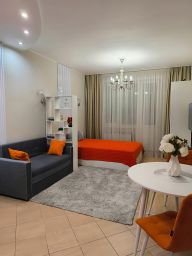 Студия тёплая, чистая, всегда свежее постельное бельё и полотенца, средства гигиены, новая двуспальная кровать с удобным матрасом, диван, телевизор, wi-fi, новая мебель, посуда, холодильник, микроволновая печь, варочная панель, водонагреватель, утюг, фен.