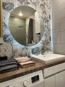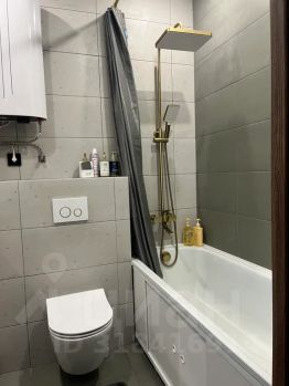 В ванной комнате большое зеркало с подсветкой и подогревом от запотевания, водонагреватель, большая ванная 170*75, стильные смесители в матовом золоте и принадлежности для гигиены.