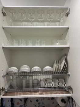 Пылесос, утюг, гладильная доска, сушилка, кастрюли, сковороды, красивая посуда, бокалы — всё это есть.