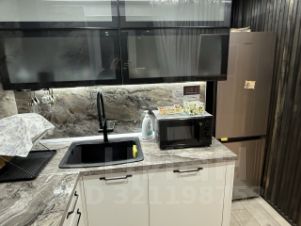 Полностью оборудованная кухня: холодильник, встроенная электрическая плита, стиральная машина, духовка, микроволновка, электрический чайник, небольшой набор посуды.