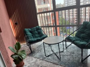 -Балкон-лоджия застеклена, для релакса есть удобные, мягкие кресла и столик.
