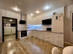 Большая кухня-гостиная с обеденной зоной со столом и стульями и зоной отдыха с большим диваном, на котором можно разместить гостей. Кухня оснащена духовым шкафом, индукционной варочной панелью, вытяжкой, посудомойкой, холодильником, микроволновкой, телевизором и фильтром для воды, шкафы с доводчиками.