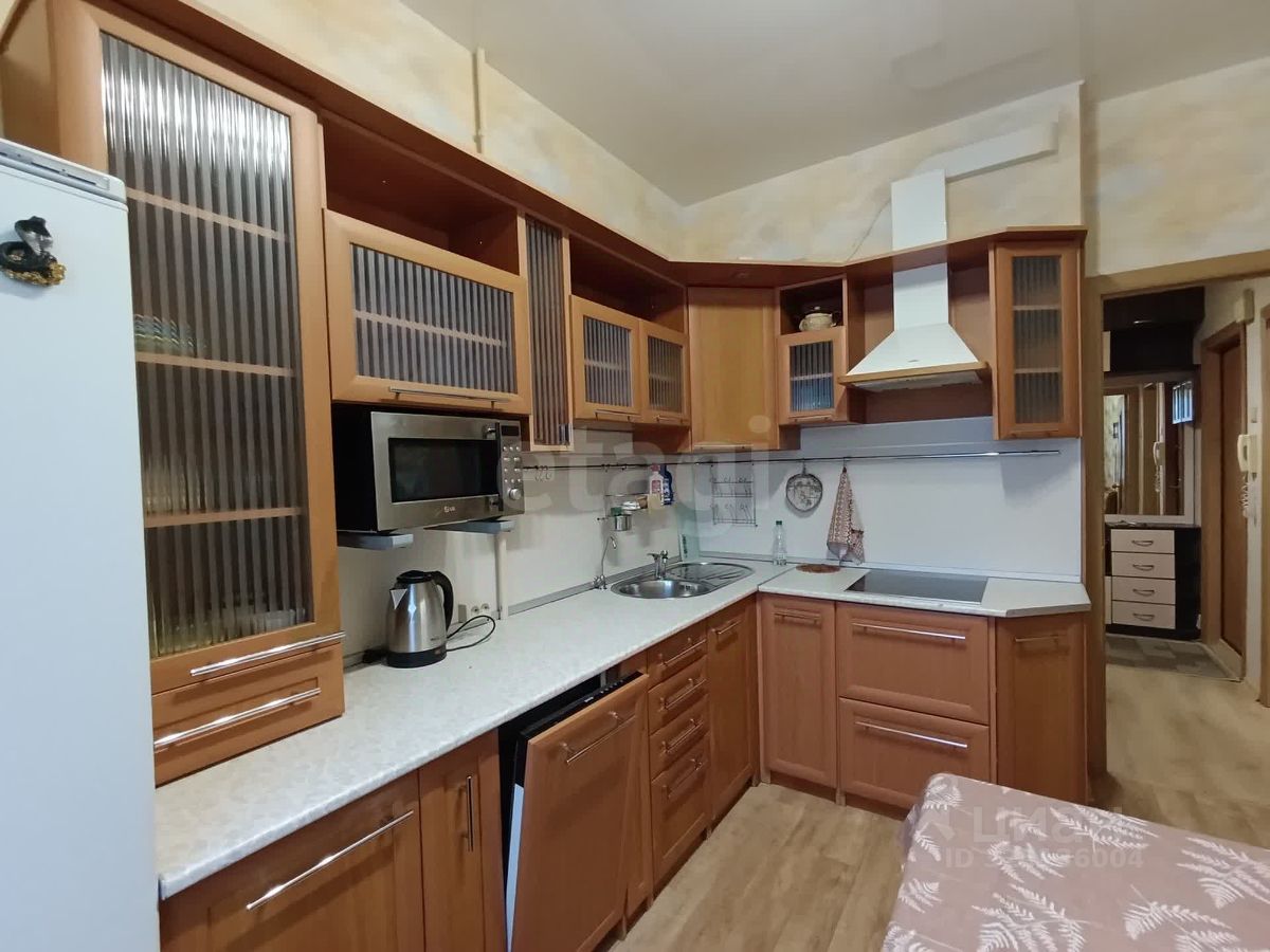 Кухня оборудована кухонным гарнитуром с электрической варочной панелью, посудомоечной машиной, холодильником, микроволновой печью.