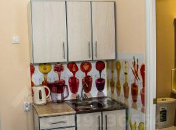 В номере 3 односпальных кровати, кухонный уголок, телевизор, холодильник, санузел с душевой кабиной, чайник.