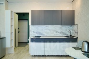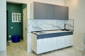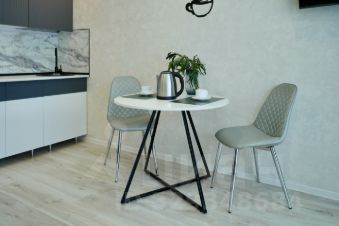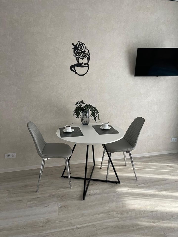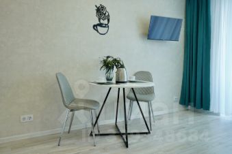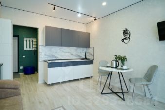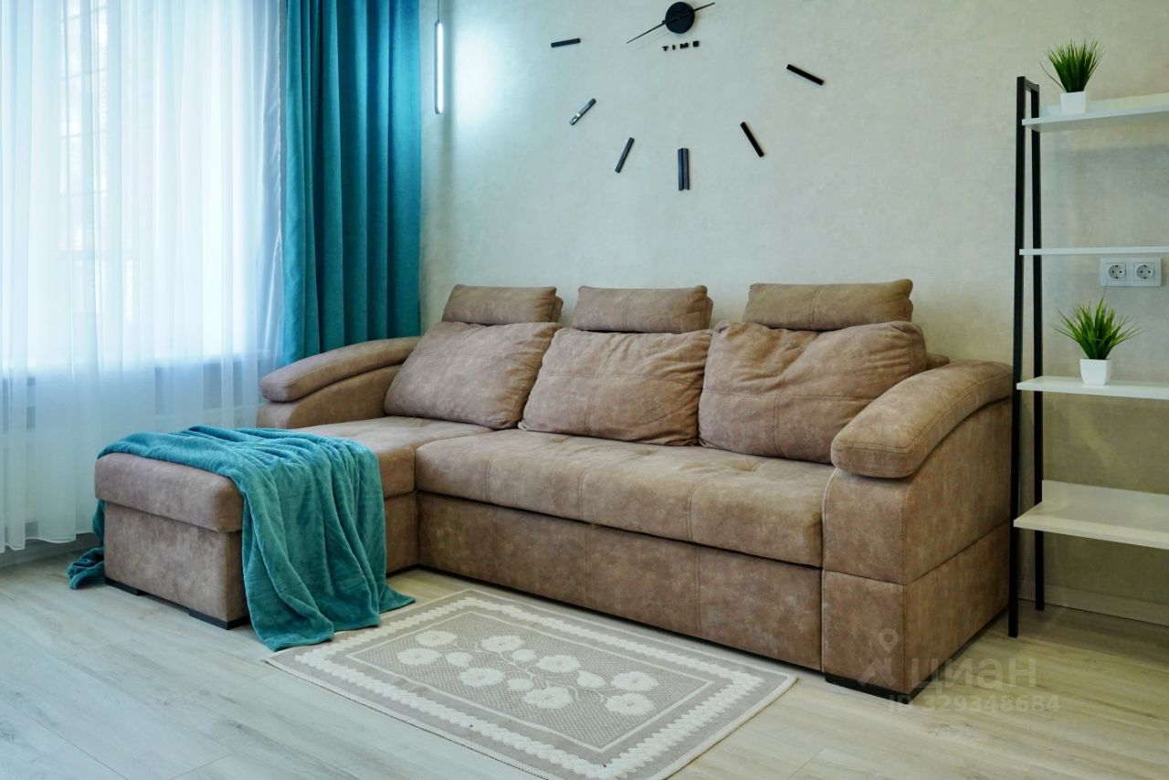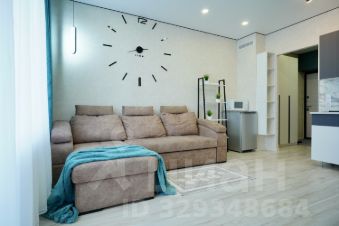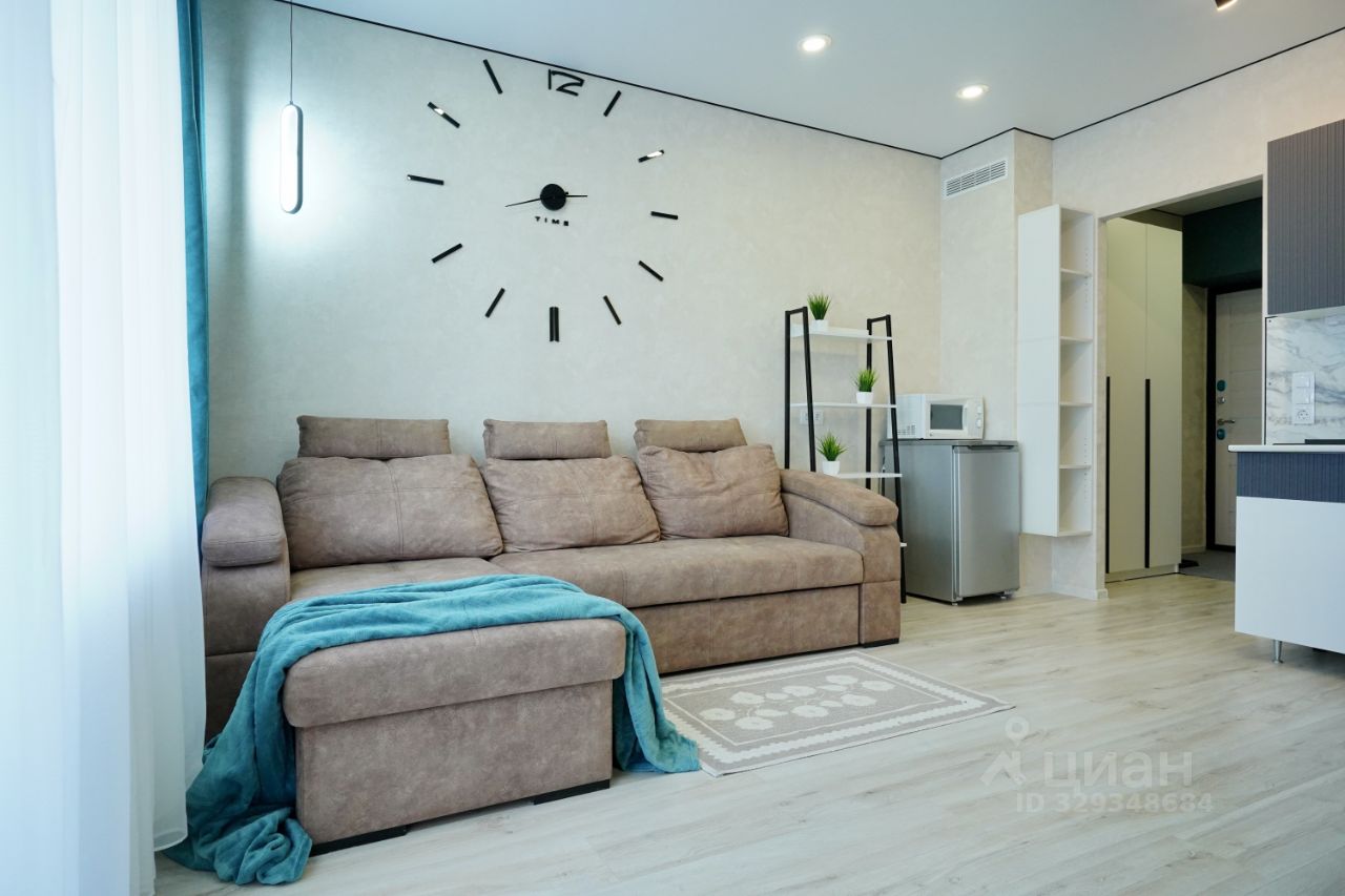 Комната обустроена угловым комфортным диваном, который легко трансформируется в полноценную двуспальную кровать. Студия может разместить до трех человек. В наличии холодильник, микроволновка, электроплита, кухонный уголок с необходимой утварью и телевизор.