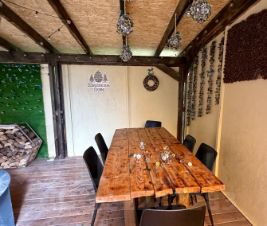 Уютная крытая терраса с камином-очагом (на котором можно готовить), диваном-качелей и большим деревянным столом.