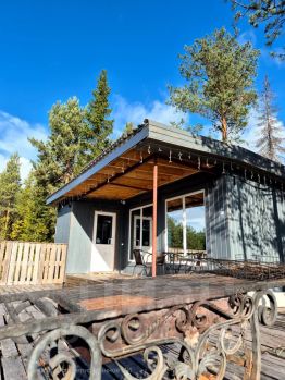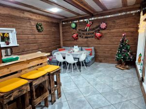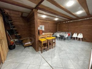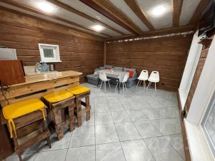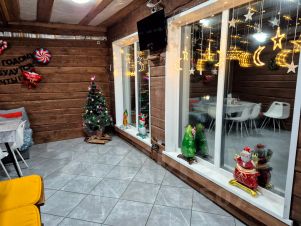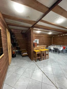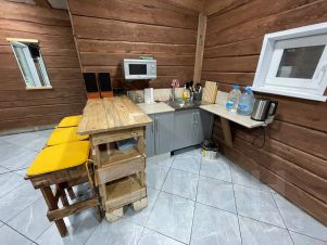 1-й этаж: прихожая, барная стойка, плитка, (посуда и приборы) + необходимая техника (телевизор, холодильник, стол, чайник, двух спальный раскладной диван), санузел.