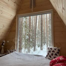 - Большое окно с видом на вековые сосны;