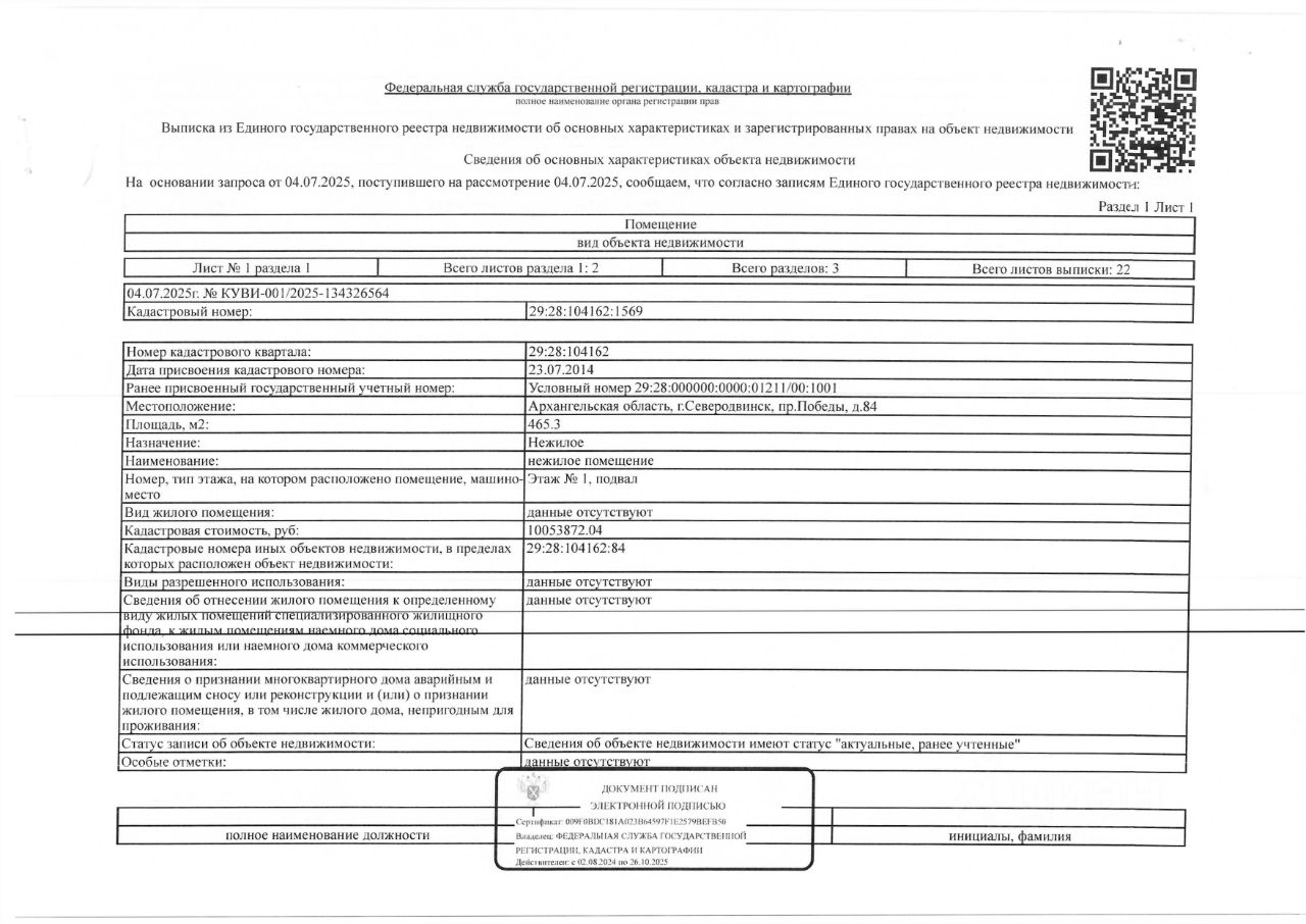 Нежилое помещение площадью 465,3 кв. м, кадастровый номер 29:28:104162:1569, адрес: Архангельская обл., г. Северодвинск, ул. Победы, д. 84 1 Штука (шт)