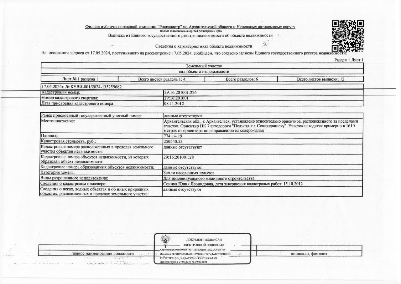 Земельный участок общей площадью 774 кв. м, кадастровый номер: 29:16:201001:226, категория земель - земли населенных пунктов, вид разрешенного использования - для индивидуального жилищного строительства. Местоположение: г. Архангельск, установлено относительно ориентира, расположенного за пределами участка. Ориентир ПК 7 автодороги "Подъезд к г. Северодвинску". Участок находится примерно в 1610 метрах от ориентира по направлению на северо-запад. 1 Штука (шт)