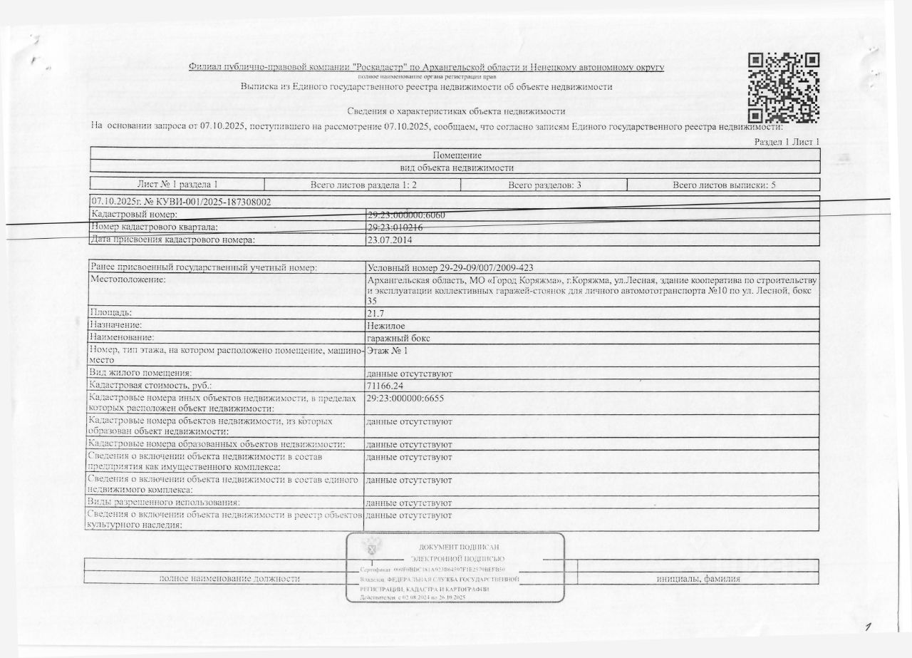 Нежилое помещение (гаражный бокс) общей площадью 21,7 кв.м, кадастровый номер 29:23:000000:6060, местонахождение: Архангельская обл., г. Коряжма, ул. Лесная, здание кооператива по строительству и эксплуатации коллективных гаражей-стоянок для личного автомототранспорта 10 по ул. Лесной, бокс 35 1 Штука (шт)