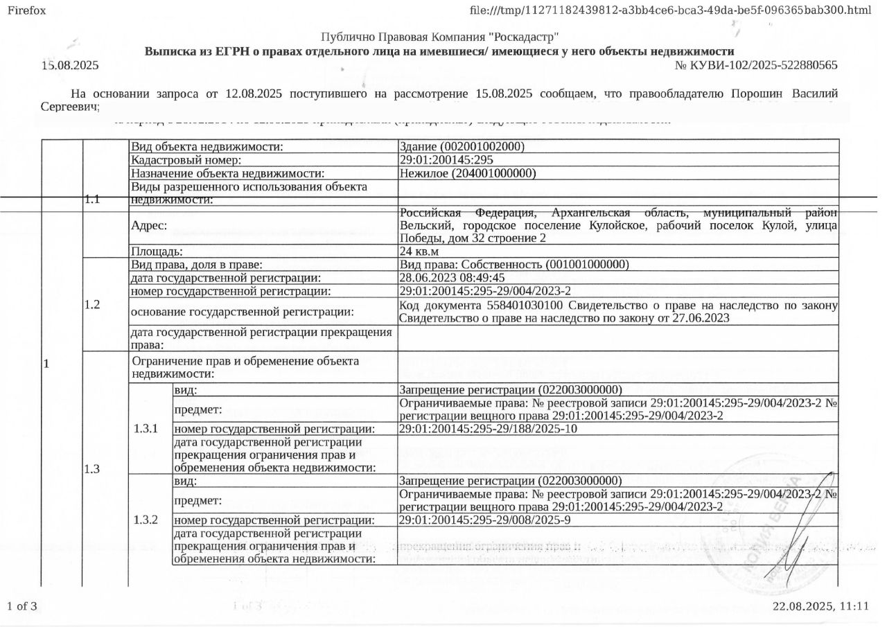 Нежилое здание общей площадью 24 кв. м, кадастровый номер: 29:01:200145:295, адрес: Архангельская обл., м.р-н Велдьский, г.п. Кулойское, рп. Кулой, ул. Победы, д. 32, стр. 2 1 Штука (шт)