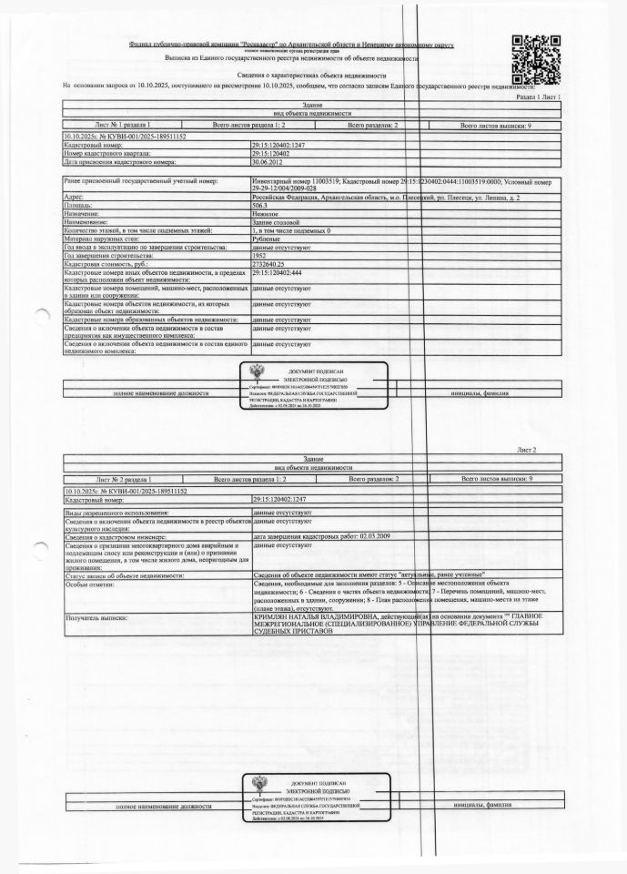 Нежилое здание (здание столовой) общей площадью 506,3 кв. м, кадастровый номер: 29:15:120402:1247, адрес: Архангельская обл., м.о. Плесецкий, рп. Плесецк, ул. Ленина, д. 2 1 Штука (шт)