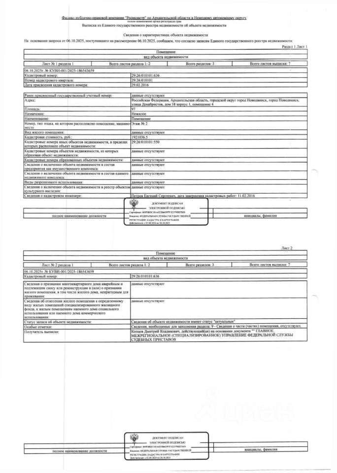 Нежилое помещение общей площадью 97 кв. м, кадастровый номер: 29:26:010101:636, адрес: Архангельская обл., г. Новодвинск, ул. Декабристов, д. 38, корп. 1, помещ. 4 1 Штука (шт)