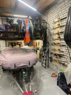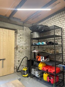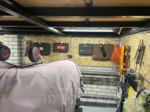 Гараж оборудован стеллажами.