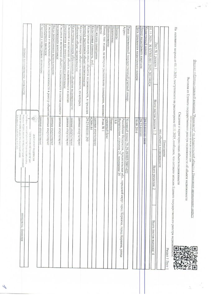 Нежилое помещение (гаражный бокс) общей площадью 19,8 кв. м, кадастровый номер: 29:23:010101:1808, адрес: Архангельская обл., г. Коряжма, ул. Вычегодская, стр. 21, помещ. 25 1 Штука (шт)