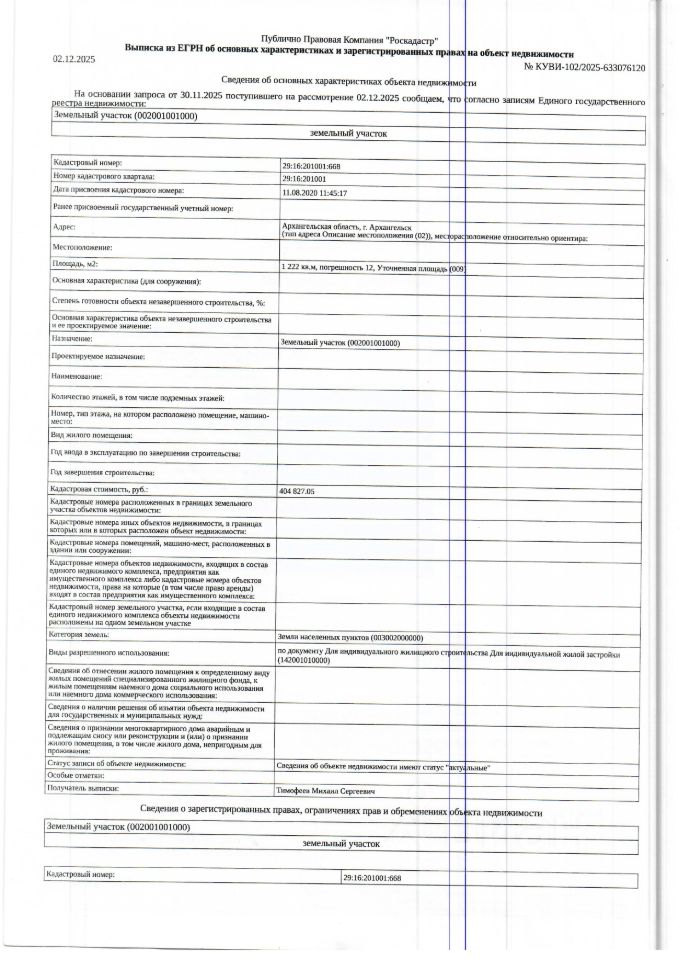 Земельный участок общей площадью 1222 кв. м, кадастровый номер: 29:16:201001:668, категория земель - земли населенных пунктов, вид разрешенного использования - для индивидуального жилищного строительства, адрес: Архангельская обл., г. Архангельск, ТСН Малое Никольское. На земельном участке располагаются 2 хозяйственные постройки, забиты 22 ЖБИ сваи, участок огорожен деревянным забором на профильных трубах 1 Штука (шт)