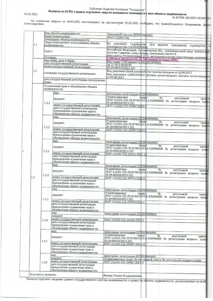 Земельный участок общей площадью 1200 кв. м, кадастровый номер: 29:07:152501:332, категория земель - земли населенных пунктов, вид разрешенного использования - садоводство, адрес: Архангельская обл., м.о. Котласский, п. Савватия, ул. Дачная, з/у 8 1 Штука (шт)