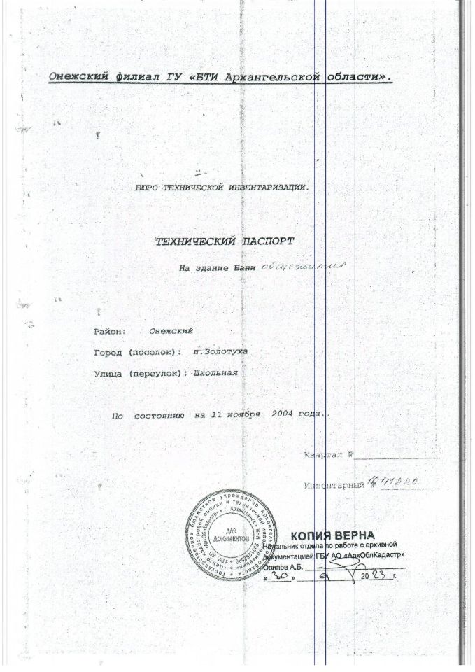 Нежилое здание общей площадью 219,4 кв. м, кадастровый номер: 29:13:110501:397. Здание 1969 года постройки, стены в кирпичном исполнении, крыша покрыта шифером, дверь отсутствует, в оконных проемах отсутствуют стекла, внутри строительный мусор, коммуникации отключены, адрес: Архангельская обл., м.р-н Онежский, с.п. Золотухское, п. Золотуха, ул. Школьная, д. 1 1 Штука (шт)