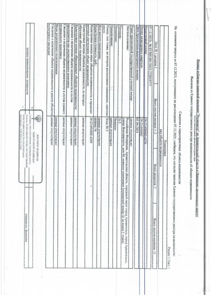 Нежилое помещение общей площадью 26,5 кв. м, кадастровый номер: 29:22:050502:4270, адрес: г. Архангельск, ул. Володарского, д. 60, помещение номер III на плане 2 этажа 1 Штука (шт)