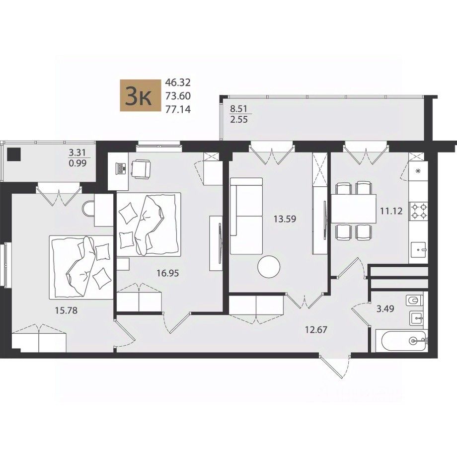Общая площадь77,14 м²