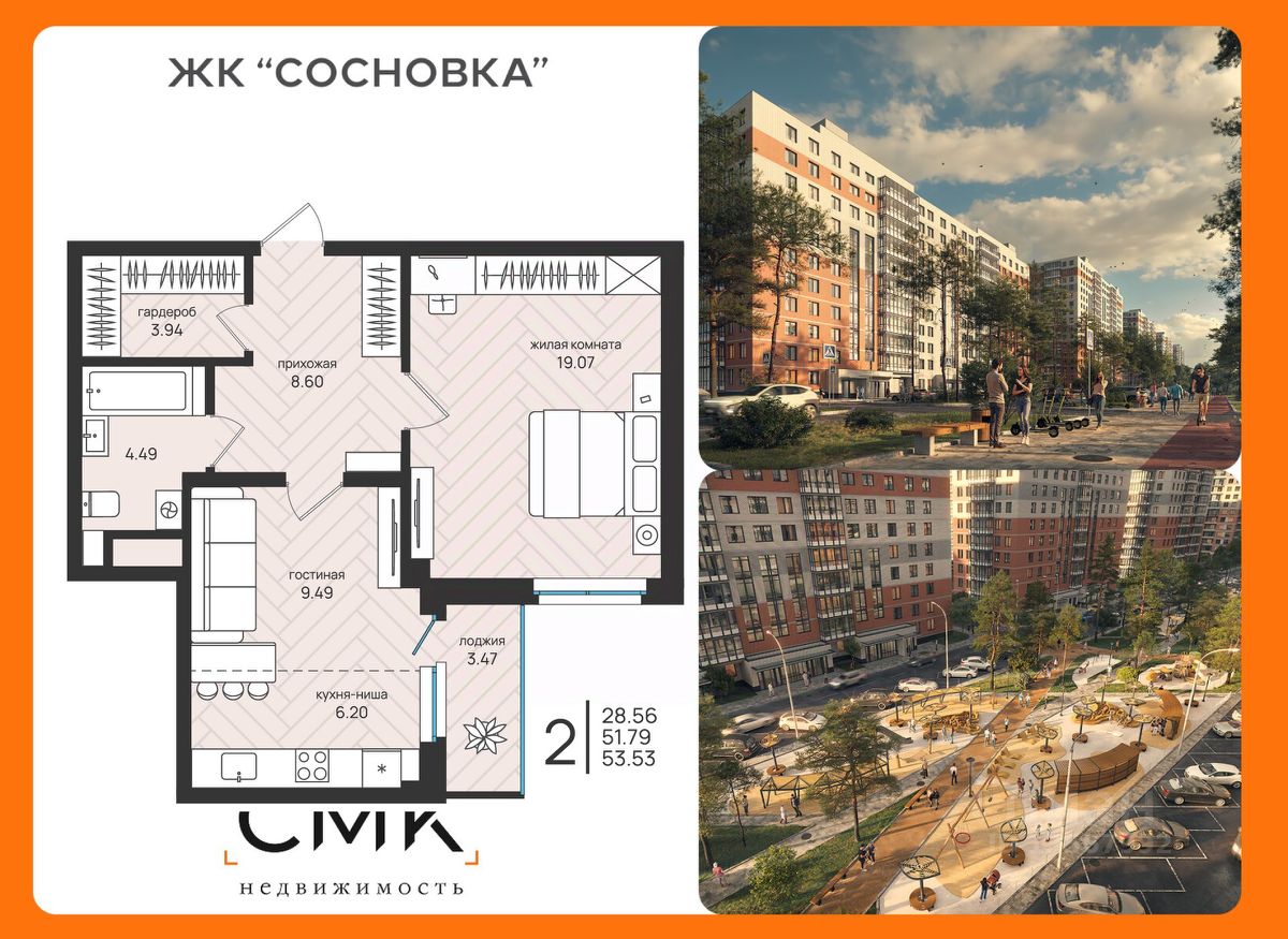 Общая площадь53,53 м²